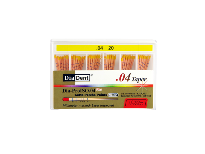 Форма штифтов № 20 DiaDent имеет конусность 04, что позволяет легко устанавливать их даже в сложных клинических случаях. К преимуществам гуттаперчи относят пластичность и гипоаллергенность этого материала.
